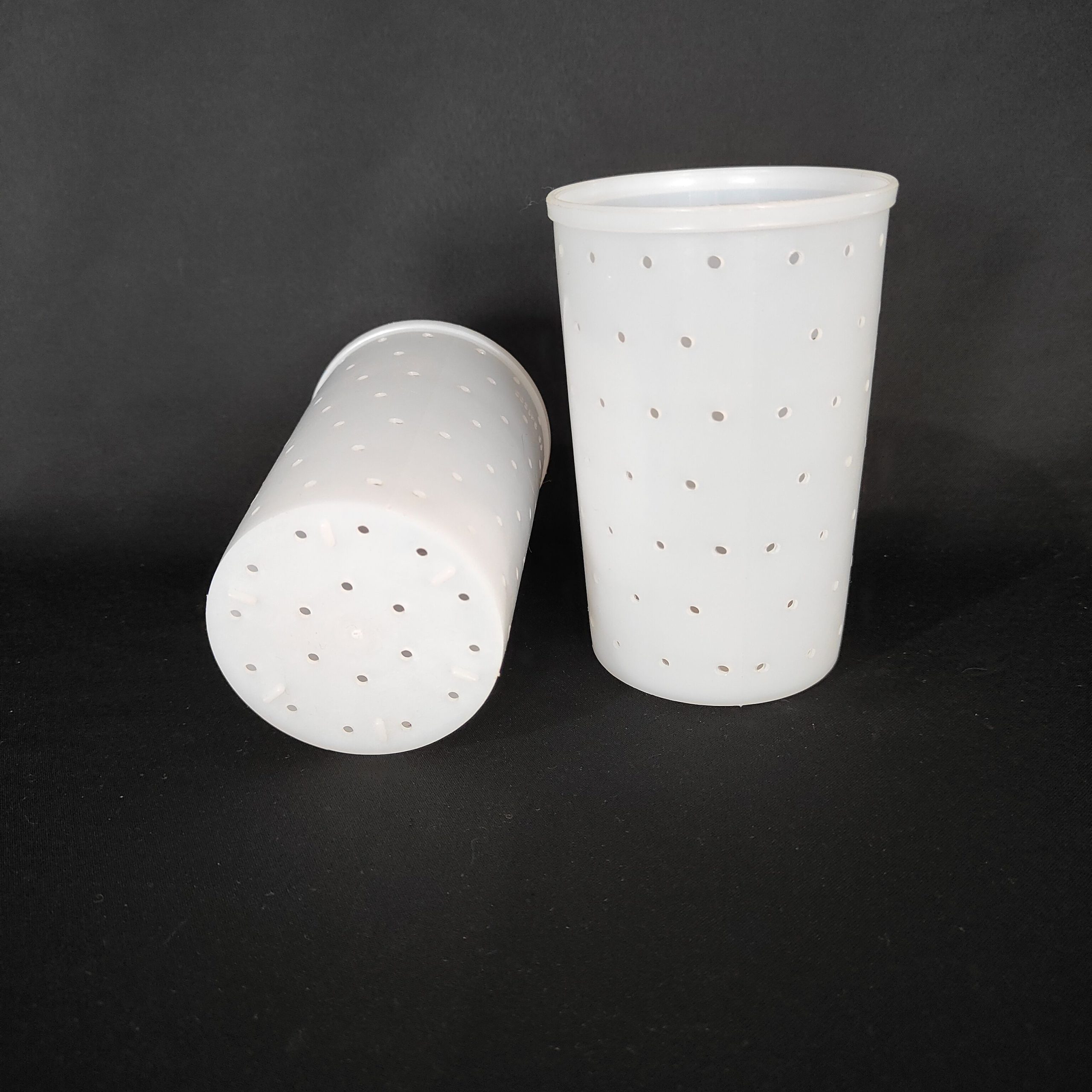 A tapered mould for making small round cheeses.